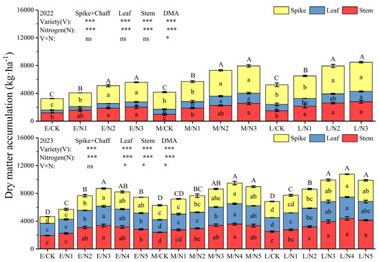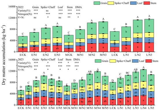 The aboveground dry matter accumulation of oats showed a significant upward trend with the increase in N application and reached its highest at the N3 level in 2022 (Figure 7 and Figure 8). At the flowering stage, the order of dry matter accumulation in each organ under CK was spike > stem > leaf. At maturity, the dry matter accumulation of L oats reached a maximum of 11,561.18 kg·ha−1 under N3, which increased by 27.81% and 8.62% compared with that of E and M oats. In 2023, the dry matter accumulation of oats showed an increasing and then decreasing trend with the increase in nitrogen application, and at the maturity stage, with the increase in nitrogen application, the dry matter accumulation of L oats reached its highest value of 12567.08 kg·ha−1 in the N4 treatment, which increased by 21.71% and 5.87%, respectively, in comparison with that of E and M oats. The interaction of variety and nitrogen fertilizer had significant (p < 0.05) effects on whole-plant dry matter accumulation (DMA) at the flowering stage and on stem, (spike + chaff), and DMA at the mature stage.