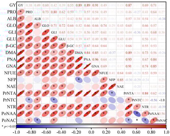 Correlation analysis of various oat characteristics. Note: GY, grain yield; PRO, protein content; ALB, albumin; GLO, globulin; GLI, alcohol-soluble protein; GLU, glutelin; β-GC, β-Glucan; DMA, dry matter accumulation; GNA, grain nitrogen accumulation; PNA, plant nitrogen accumulation; NFUE, nitrogen fertilizer utilization efficiency; NFP, nitrogen fertilizer productivity; NAE, nitrogen fertilizer agricultural efficiency; PrNTA, pre-flowering nitrogen translocation amount; PrNTC, pre-flowering nitrogen translocation contribution; NTR, pre-flowering nitrogen translocation rate; PoNAA, post-flowering nitrogen accumulation amount; PoNAC, post-flowering nitrogen accumulation contribution. Red represents a positive correlation; blue represents a negative correlation. * means significantly different at the 0.05 level.