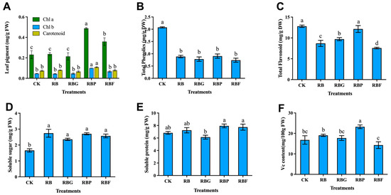 The contents of chlorophyll, total phenolic, total flavonoid, Vc, soluble sugar, and soluble protein were measured (Figure 3). Compared with CK, the contents of chlorophyll a, chlorophyll b, and carotenoid in Chinese cabbage leaves under RB light were not significantly changed (Figure 3A). Compared with RB light, the content of chlorophyll a under RBP and RBF treatments was significantly higher, with RBP treatment increasing by 106.3%. The chlorophyll b and carotenoid contents under RBP treatment were significantly increased by 126.7% and 36.8%, respectively, compared to the RB treatment.
