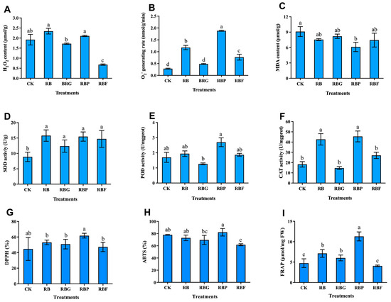 Effects of spectra on antioxidant characteristics of Chinese cabbage leaves under different LED treatments (p < 0.05). (A): content of hydrogen peroxide; (B): Superoxide anion generating rate; (C): Malondialdehyde (MDA); (D–F): the activity of superoxide dismutase (SOD), peroxidase (POD), and catalase (CAT) under different treatments; (G,H): Antioxidant evaluation indicators of Chinese cabbage under different treatments; (I): Ferric ion reducing antioxidant power (FRAP) under different treatments. Data represent means ± s.d. (n = 3 biological replicates). Significant differences were determined by Duncan’s multiple range test. The letters represent the significant difference of different treatments (p < 0.05).