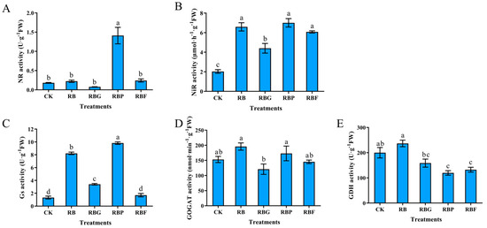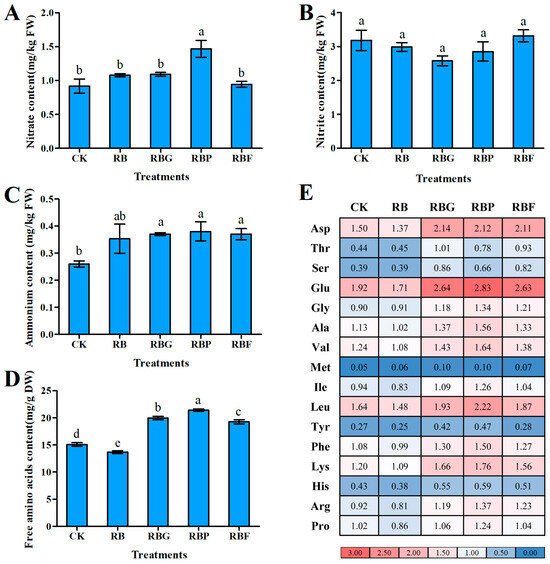 Compared with CK, the content of nitrate and nitrite under RB, RBG, and RBF treatments showed no significant difference, but the nitrate content of Chinese cabbage treated with RBP was significantly higher by 60.44% (Figure 5A,B). The ammonium content of Chinese cabbage leaves under RBG, RBP, and RBF treatments was significantly increased by 42.31%, 46.15%, and 42.31%, respectively, compared with CK, but they did not reach a significant value of p < 0.05 compared with RB (Figure 5C).