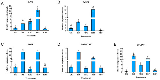 For the fluorescent quantitative PCR analysis of gene expression, the sequences of BrNR, BrNiR, BrGS, BrGOGAT, and BrGDH were amplified with primers designed on the basis of the sequences obtained from NCBI (Supplementary Table S2). The expression data were analyzed with the 2−ΔΔCt method as previously described (BioRad Real-time PCR Application guide) [31].
