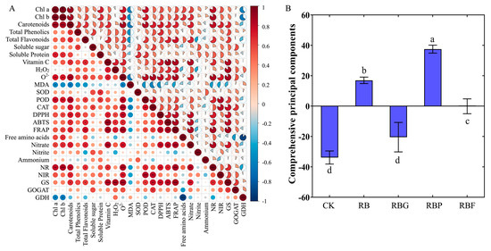 Correlation analysis and comprehensive evaluation on the growth, quality, antioxidant capacity and nitrogen metabolism of Chinese cabbage. (A): The correlation analysis of the indicators measured in this experiment; (B): Comprehensive evaluation of different light treatment on the growth, quality, antioxidant capacity and nitrogen metabolism. The asterisks in (A) and letters in (B) represent the significant difference of different treatments (p < 0.05).