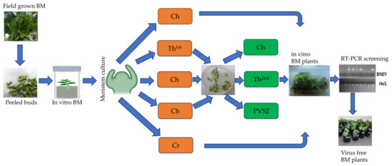 - Raj, R.; Kaur, C.; Agrawal, L.; Kumar, S.; Chauhan, P.S.; Raj, S.K. Development of a protocol for the elimination of Cyrtanthus Elatus virus A from Narcissus Tazetta by in vitro chemotherapy in combination with electrotherapy. J. Virol. Methods 2022, 300, 114368. [Google Scholar] [CrossRef]