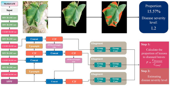 In this context, we propose a composite framework, CVW-Etr, for estimating cotton verticillium wilt severity levels under natural field conditions. CVW-Etr is based on the YOLOv8-Seg model and incorporates the RFCBAMConv, C2f-RFCBAMConv, AWDownSample-Lite, and GSegment modules. Additionally, it incorporates YOLOv8-Seg with MobileSAM. The architecture of CVW-Etr is visualized in Figure 2. The framework comprises five main components: input, pre-segmentation, backbone, neck, head, and disease severity level estimation. The methods and enhancements integrated into CVW-Etr are as follows: