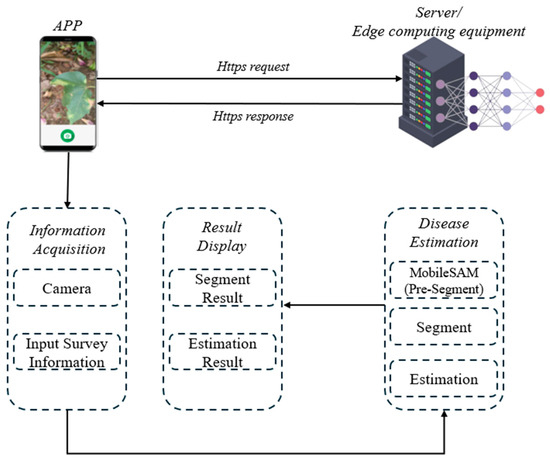 In large-scale assessments of cotton Verticillium wilt, evaluating numerous cotton varieties requires surveyors to complete assessments quickly and sync the results to the Cloud for further analysis. Processing data solely on smartphones proved inefficient, leading to increased wait times. Additionally, at tropical cotton breeding sites, where temperatures often exceed 25 °C, field tests revealed that running models locally caused smartphone processors to overheat and even shut down, significantly slowing the survey process and reducing efficiency. To address this, we developed an application for estimating cotton disease severity, implementing a solution that transfers data via HTTPS to a server or edge computing device, improving processing speed and enhancing system stability.