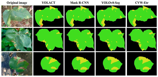 To further substantiate the performance of the CVW-Etr model, we randomly selected segmentation results from various instance segmentation models, as displayed in Figure 7. In these visualizations, green represents the segmentation of diseased leaves, yellow represents the segmentation of lesions, and orange or the absence of a mask indicates missegmentation.
