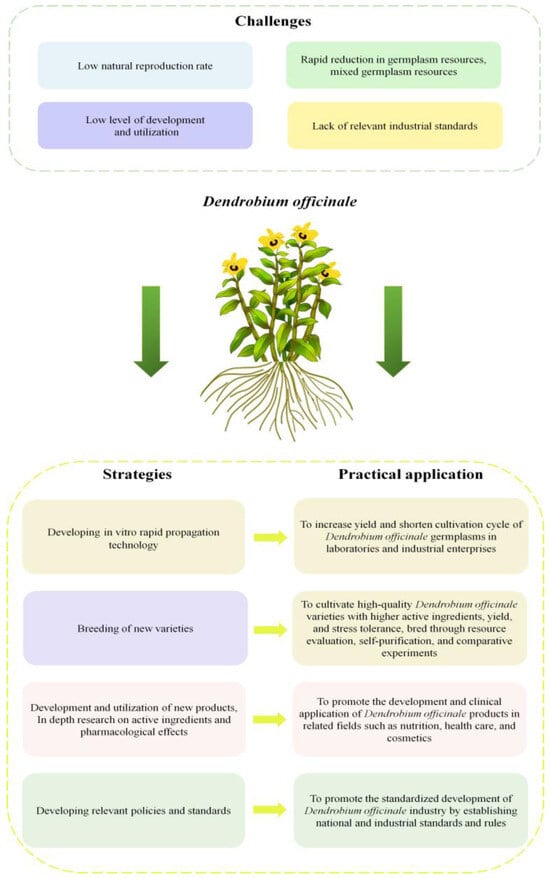 Currently, no national standards associated with the D. officinale industry have been issued in China. This situation has led to a predominant focus on yield at the expense of quality and the common malpractice of overusing pesticides, fertilizers, and growth-modifying chemicals. To broaden the applications of D. officinale and its derivatives, enhance their quality and safety, and minimize pesticide residues, localized standards have been issued in some provinces of China, such as Zhejiang, Yunnan, Guizhou, and Guangxi. These initiatives aim to advance the standardization and development of the D. officinale industry nationwide. Therefore, this review comprehensively summarizes the current state of the D. officinale industry, including development challenges, advancements in artificial propagation techniques, and research on pharmacological applications. It proposes targeted strategies such as strengthening the conservation of D. officinale germplasm resources, innovating pharmaceutical development and clinical usage, and establishing relevant national guidelines. These strategies are aimed at exploring effective approaches for accelerating the growth of the D. officinale industry, enhancing its societal and economic contributions, and facilitating the rapid expansion of D. officinale-based clinical treatments, as well as its broader applications in the healthcare services domain (Figure 1).
