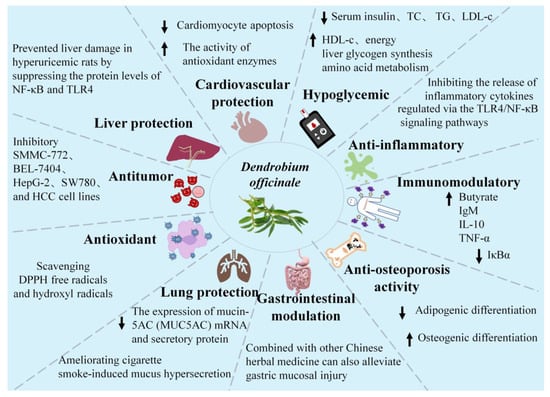 D. officinale exhibits remarkable anti-inflammatory activity. For instance, research into DOPs and their essential structural domain (EDOP) [29] has demonstrated their efficacy in protecting against colitis induced by dextran sulfate sodium in murine models. The findings indicate that both DOP and EDOP can mitigate pertinent symptoms by inhibiting serum levels and the mRNA expression of the pro-inflammatory cytokines tumor necrosis factor-α (TNF-α), IL-6, and IL-1β, elevating short-chain fatty acid levels, activating G-protein-coupled receptors, and modulating the gut microbiota. Another investigation by Liang et al. [30] revealed that DOPs ameliorated learning and memory impairments in mice, induced by ovariectomy (OVX) and D-galactose (D-GAL) through the upregulation of the Nrf2/HO-1 pathway. This mechanism prevented hippocampal neuronal cell damage caused by OVX and D-GAL and markedly alleviated neuroinflammation. While studies on its anti-inflammatory effects are still progressing and necessitate further in-depth in vivo studies and clinical trials, the development of anti-inflammatory drugs derived from D. officinale represents a promising avenue of research.