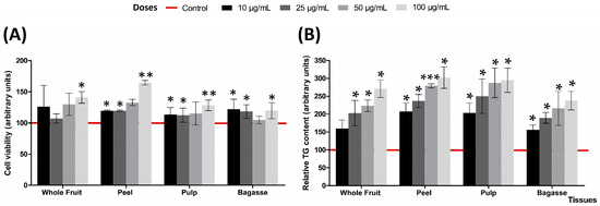 From the pulverised freeze-dried Opuntia stricta var. dillenii tissues (whole fruit, pulp, peel) and by-product (bagasse), extracts rich in betalains and phenolic compounds were obtained as previously documented [9]. In summary, 1 g of each freeze-dried tissue was subjected to extraction using a 5 mL mixture of ethanol and water (1:1, v/v). This extraction procedure was repeated twice using 3 mL of ethanol and water (1:1, v/v) in each iteration. A final extraction was carried out using 3 mL of pure ethanol. The solvents in the supernatants were then reduced to a minimal volume using a rotary evaporator (Buchi, Flawil, Switzerland) set at 25 °C. Aliquots of each tissue extract were freeze-dried and stored at −20 °C until further use.
