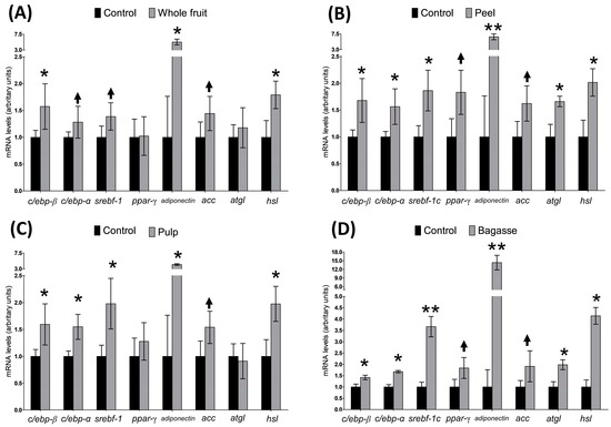 Effects of Opuntia stricta var. dillenii extracts at a dose of 100 µg/mL from (A) whole fruit, (B) peel, (C) pulp (D) and bagasse on gene expression of c/ebp-β, c/ebp-α, srebf-1c, ppar-γ, adiponectin, atgl, acc and hsl in 3T3-L1 maturing pre-adipocytes treated from day 0 to day 8. Values are means ± SEM. Comparisons between each tissue extract dose and the control were analysed by Student’s t-test. The asterisks represent differences versus the controls (* p < 0.05; ** p < 0.01). Arrows mean a tendency (p < 0.10).