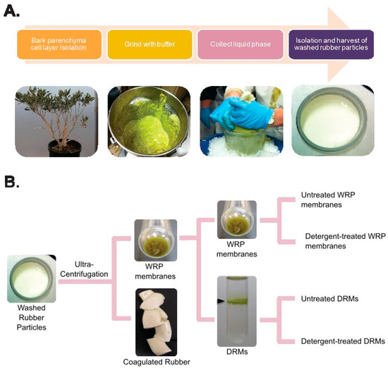 Isolation of rubber particle membrane and membrane microdomains. (A). Isolation of enzymatically active washed rubber particles from guayule bark parenchyma tissues. Guayule bark was collected from stems and defoliated branches of harvested shrub. Tissues were ground and WRPs were isolated via liquid extraction and washed using low-speed centrifugation (<10,000× g). (B). Isolation of membranes and detergent-resistant membrane microdomains from guayule WRPs. Membranes and DRMs were prepared as detailed [27]. Following isolation, WRPs were resuspended in membrane extraction buffer, and then membranes were isolated by subjecting WRPs to high-speed ultracentrifugation at 100,000× g, 4 °C for 50 min. During this step, rubber particle membranes precipitated to the bottom of the tube, while the latex fraction floated to the top. The latex fraction was coagulated with glacial acetic acid and removed from each sample. The membrane fraction was weighed, then resuspended and split into two sub-fractions. One sub-fraction (membrane) was washed, re-precipitated, weighed, and sent for proteomic and lipid profiling analyses. The other sub-fraction (detergent resistant membrane microdomains; DRMs) was weighed, resuspended, treated with 0.1% (v/v) Triton-X 100, layered onto a sucrose gradient, and subjected to a second round of ultracentrifugation. DRMs, which floated to the interface between the sucrose layers (black arrow on the image of the “DRM” tube), were collected, washed, precipitated, weighed, and sent for proteomic and lipid profiling analyses.
