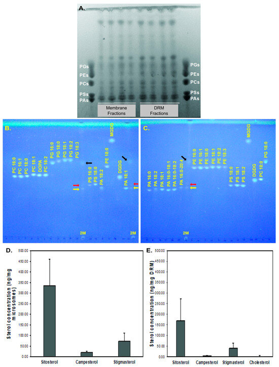 Thin-layer chromatographic analyses of membrane and detergent-resistant membrane microdomain fractions isolated from rubber particles. (A). TLC of RP membrane and DRM fractions. Samples were run against a mixture of phospholipid standards and phosphatidic acids. Lipids were imaged using primulin. (B,C). TLC of a representative RP membrane fraction (1 µg standards loaded and 6 µL guayule sample per TLC plate). Glycerophospholipids were resolved first by head-group and then, to a lesser degree, by chain length and saturation. TLC analyses indicated the most prevalent components of the RP and DRM samples were phosphatidic acids (PA 18:1; yellow arrow), phosphatidylglycerol (PG 18:0; black arrow), and potentially phosphatidylserine (PS 18:0; red arrow). The assay was repeated 4 times and representative data are shown here. (D,E). LC-MS/MS quantification of sterols in guayule membrane (D) and detergent-resistant membrane microdomain (E) fractions. Sterols were extracted using chloroform:methanol (70:30) and quantified using QQQ LC-MS/MS. Retention times and mass transitions for sterols were determined using authentic standards. Quantifications were performed using deuterated authentic standards.