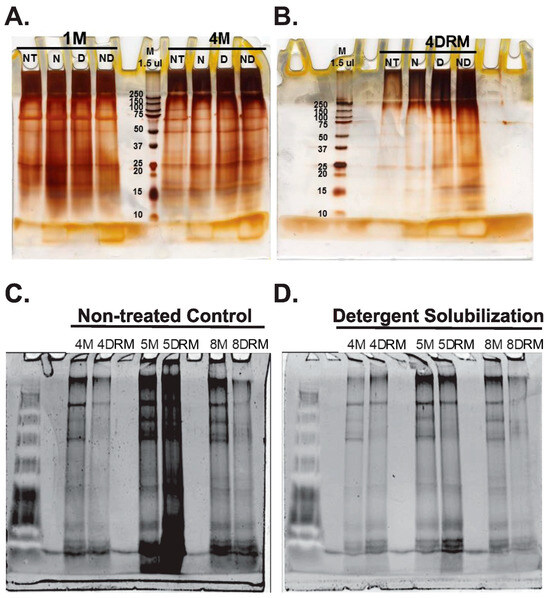 Isolation of proteins from rubber particle membranes. (A,B). Detergent solubilization of proteins from guayule RP membrane (A) and detergent-resistant membrane microdomain (B) fractions. Proteins were separated using SDS-PAGE and visualized via silver staining. NT: non-treated control; N: NP-40 substitute (2% v/v); D: deoxycholate (0.5% v/v); ND: NP-40 substitute and deoxycholate (0.25% each, v/v). (C,D). Separation of WRP peptides for sequencing. Three paired biological replicates of both RP membrane (4M, 5M, 8M) and detergent-resistant membrane microdomain (4DRM, 5DRM, 8DRM) fractions were prepared, separated via SDS-PAGE, and visualized using SYPRO staining. (C). Non-treated samples. (D). Samples treated with 0.5% deoxycholate.