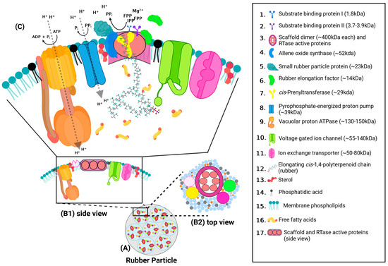 Model of a putative rubber transferase (RTase) complex embedded in detergent-resistant membrane microdomains located extensively throughout the unilamellar RP membrane. Identities of individual RTase members are detailed in the inset to the right of the model. (A). Top-down view of RTase complexes in the RP membrane. RTase complexes are located in detergent-resistant membrane microdomains (DRMs; light-blue circles), which make up a significant portion of the RP membrane. Non-DRM membrane is represented as a gray background. (B1,B2). Magnified views of a single RTase complex embedded in a DRM. (B1). A side view showing the RTase complex position in the RP DRM microdomain. Sterols and phospholipids crucial to the formation and maintenance of this membrane microdomain are highlighted as red sterol backbones and dark gray phospholipids, respectively. (B2). Top-down view of the putative RTase complex in the DRM. Sterols and phosphatidic acid are highlighted as orange and gray circles, respectively. The site of active rubber synthesis formed by catalytic sites on the RTase scaffold serves as a “functional pore” in the membrane in which substrate is converted into rubber chains, which are fed into the interior of the particle. (C). Detailed view of the function of the putative RTase complex in a DRM microdomain. The large dimeric scaffold holds the proteins critical to making the rubber polymer in place and forms the hydrophobic channel to the particle’s interior. As the synthesis of rubber molecules proceeds at the catalytic site of the RTase complex, the hydrogen and pyrophosphate ions generated during catalysis gradually accumulate in the inner surface of the membrane adjacent to the allene oxide synthase-like/RPP proteins, potentially acidifying the environment and/or inhibiting or halting polymerization. To prevent this from occurring, RTase-associated pyrophosphate-energized proton pumps hydrolyze excess pyrophosphate and remove excess protons into the interior of the RP. ATP-ases and ADP/ATP antiporters also function in maintaining proton and ATP homeostasis in the RP. Other ion channels function to maintain homeostasis of calcium, magnesium, or other cations in the area around the RTase complex.