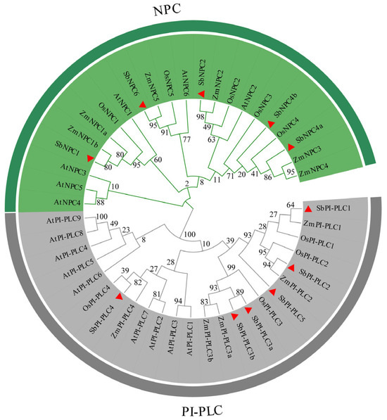 To investigate the evolutionary relationships of PLCs between sorghum and other species, we analyzed 15 AtPLCs from A. thaliana, 9 OsPLCs from O. sativa, 11 ZmPLCs from Z. mays, and 11 SbPLCs from sorghum. A maximum likelihood (ML) phylogenetic tree was generated (Figure 1). Through sequence alignment and phylogenetic analysis, the 46 proteins were categorized into two subfamilies, PI-PLCs and NPC. SbPLCs proteins show a close association with ZmPLCs proteins, suggesting a strong relationship, but they are more distantly related to AtPLCs proteins.