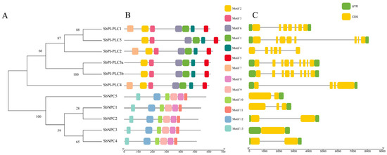 Conserved motifs and exon–intron structure analysis of the PLC gene in sorghum. (A) Phylogenetic tree of SbPLCs. The tree was generated using MEGA7 through the maximum likelihood method based on the protein sequences of SbPLCs. (B) Conserved motif analysis. Eleven motifs were identified, with different colored boxes representing various types of motifs. (C) Exon–intron structures. Exons and introns of S. bicolor are depicted as yellow rounded rectangles and thin lines.