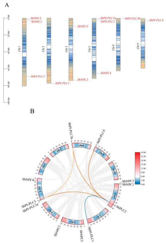 Chromosomal mapping, gene replication, and synteny analysis of SbPLCs. (A) Chromosomal localization of SbPLCs. The yellow font indicates the sorghum chromosome number, the red font displays the names of the SbPLCs, and the scale on the left represents the length of each chromosome. (B) Gene replication and synteny analysis of SbPLCs. The outer box represents the GC content of the chromosome, while the inner box illustrates the gene density of the chromosome. The names of the SbPLCs genes are highlighted.