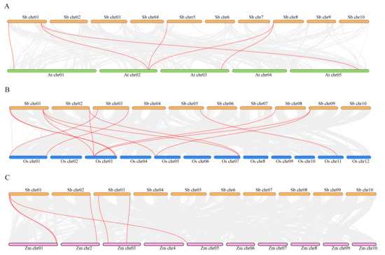 Collinearity analysis of the PLC gene in sorghum with other species. (A) Synteny analysis of SbPLCs and AtPLCs. (B) Synteny analysis of SbPLCs and ZmPLCs. (C) Synteny analysis of SbPLCs and OsPLCs. The red lines highlight the syntenic PLC gene pairs.