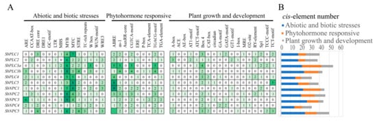 To understand the expression patterns and potential functions of SbPLCs under different conditions, the 2000 base pairs upstream of the translation initiation site for each gene were submitted to the Plant CARE database to retrieve putative cis-acting elements. The identified elements were categorized into three groups: abiotic and biotic stresses elements, phytohormone responsive elements, and plant growth and development elements (Figure 5).
