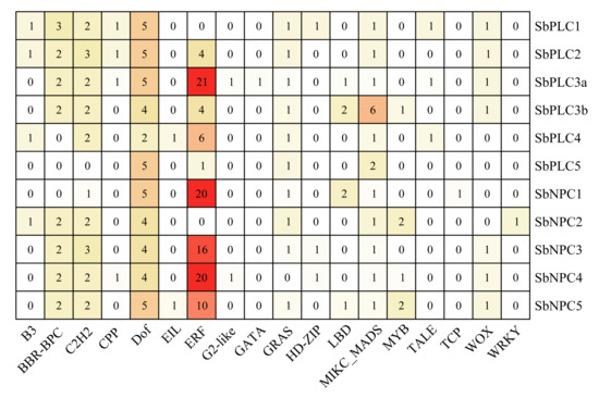 Prediction of transcription factors regulating SbPLCs in sorghum. The numbers and varying intensity colors within the grid represent the quantity of different transcription factors within the SbPLCs.