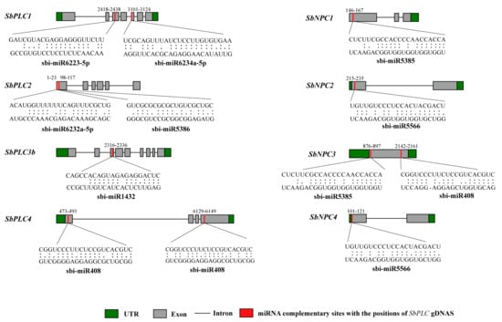miRNA targeting SbPLCs. Schematic illustration indicates the SbPLCs targeted by miRNAs. The RNA sequence of each complementary site is from 5′–3′, and the predicted miRNA sequence from 3′–5′ is exposed in the long-drawn-out areas. See Table S5 for the detailed data of all predicted miRNAs.