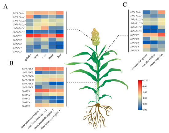 The expression patterns of 11 SbPLCs in various tissues and organs were analyzed using the Sorghum Expression Database (SorghumFDB), and a heatmap was constructed (Figure 8). Expression patterns of SbPI-PLCs and SbNPCs were examined across diverse tissues. SbPI-PLC1 showed substantial expression in leaves, roots, and spikelets, whereas SbPI-PLC2 exhibited higher expression in stems. Notably, SbNPC1 displayed the highest expression in leaves and spikelets, emphasizing its crucial role in these tissues (Figure 8A). In stem internode regions (Figure 8B), SbPI-PLC1 and SbNPC1 demonstrated varied expression, with higher levels in regions one and two. In contrast, SbPI-PLC2 displayed increased expression in regions three and four, suggesting region-specific functions in stem development. The expression levels in nonvascular systems, vascular systems, and whole organisms are depicted (Figure 8C). SbPI-PLC1 exhibited notable expression in whole organisms and vascular systems, while SbPI-PLC2 showed increased expression in nonvascular systems and whole organisms. SbNPC1 displayed substantial expression in whole organisms and vascular systems, highlighting its significance in these biological contexts. These findings provide insights into the tissue-specific expression patterns of SbPI-PLC and SbNPC, contributing to our understanding of their roles in sorghum development.