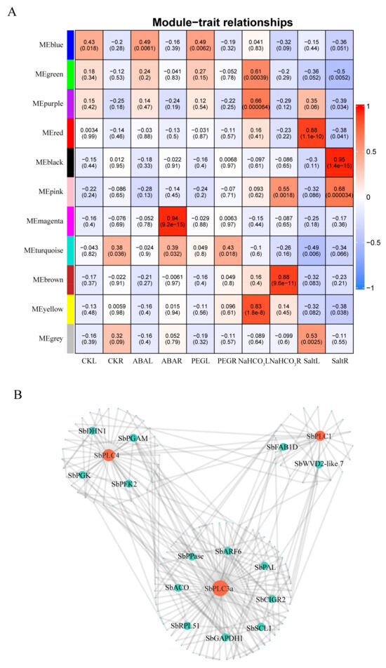 To identify important regulatory genes and the regulatory roles of genes under abiotic stress, we constructed a gene co-expression network using WGCNA. A total of 11 modules were constructed, correlating with 10 phenotypic data (CKL, CKR, ABAL, ABAR, PEGL, PEGR, NaHCO3L, NaHCO3R, SALTL, SALTR), determined based on a p-value < 0.05 threshold, resulting in 20 treatment/organ-related modules (Figure 10A). Among these, five modules exhibited a strong positive correlation with phenotypic features, with correlation coefficients ≥ 0.8 and p-value ≤ 0.05, namely: ABAR/magenta (0.94), NaHCO3L/yellow (0.83), NaHCO3R/brown (0.88), SALTL/red (0.88), and SALTR/black (0.95). Within these correlated modules, we found three modules containing SbPLCs, i.e., ABAR/magenta containing SbPLC4, NaHCO3L/yellow containing SbPLC1, and SALTR/black containing SbPLC3a.