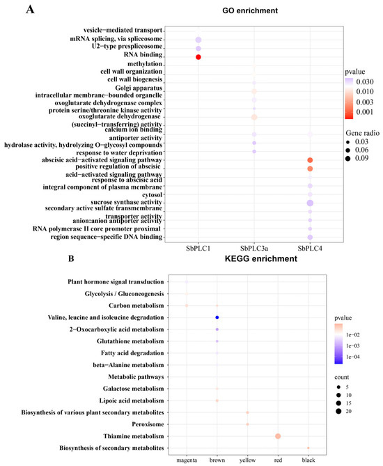 To explore the functions of SbPLC1, SbPLC3a, and SbPLC4, along with their co-expressed genes, GO annotation and analysis were conducted (Figure 11A). The results revealed that the GO enrichment of the SbPLC1 gene and its co-expressed genes included (i) mRNA processing (GO:0006397), vesicle-mediated transport (GO:0016192), mRNA splicing via spliceosome (GO:0000398), (ii) U2-type prespliceosome (GO:0071004) in the “cellular components”, and (iii) RNA binding (GO:0003723) in the “molecular functions”. These GO terms mainly relate to mRNA transport processing, a crucial part of gene expression regulation, suggesting a potential role of SbPLC1 in mRNA processing synthesis.