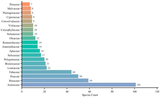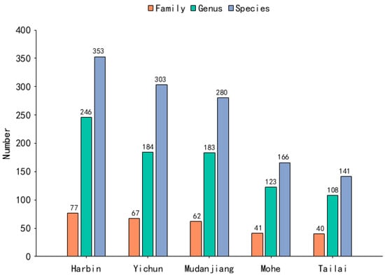 A total of 633 examples of spontaneous vegetation belonging to 93 families and 341 genera were recorded in five cities in Heilongjiang Province, and Compositae, Rosaceae, Gramineae, and Fabaceae were the dominant families, with species numbers of 101, 59, 50, and 44, respectively (Figure 1). There are significant differences in the number of examples of spontaneous vegetation in different cities (Figure 2).