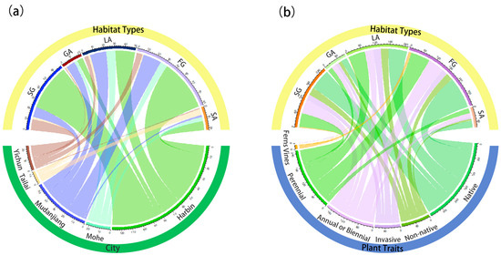 (a) Chord diagram illustrating the relationship between cities, habitats, and dominant community types of native plants. (b) Chord diagram illustrating the relationship between habitats, plant traits, and dominant community types of native plants.