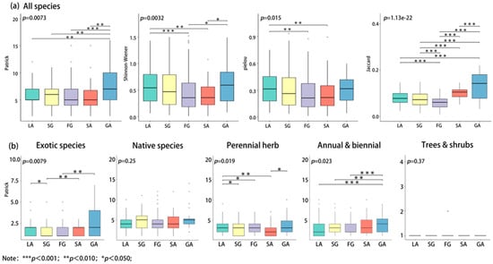 The diversity index of spontaneous vegetation shows different distribution characteristics in different habitat types. The Patrick richness index and the Shannon–Wiener diversity index of spontaneous vegetation are the highest in the GA habitat type, while the Pielou evenness index dominates in the LA habitat type and shows significant differences among different habitat types (p < 0.05). From a similarity perspective, there are more shared species in the GA habitat, while there are significant differences in regards to species composition in the FG habitat type (Figure 5a). Meanwhile, the species composition of the GA and SA habitat types is relatively similar, whereas the species composition of the FG habitat differs significantly from that of the other habitats (Figure S1). There are significant differences (p < 0.05) among non-native spontaneous vegetation types in different habitats (p < 0.05), while the differences among native plants are not significant (p > 0.05), but the species richness index of native plants is generally higher. The species richness index of perennial herbaceous plants showed significant differences in different habitats (p < 0.05), with the lowest value occurring in the SA habitat type. The diversity index of trees and shrubs is relatively low, and the differences in different habitat types are not significant (p > 0.05) (Figure 5b).