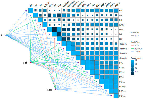 Correlation between native plant richness and environmental factors. Area: patch area; BD: average distance from patch to urban edge; P/A: perimeter–area ratio of patches; LSI: patch landscape shape index; NN: distance between neighboring patches; PC: percentage of woody cover in patches; ICNCP: relative richness of cultivated plants in patches; BV50/100/300/500: building volume within 50/100/300/500 m buffer of patches; Sealed50/100/300/500: impervious surface within 50/100/300/500 m buffer of patches; POP50/100/300/500: population density within 50/100/300/500 m buffer of patches.