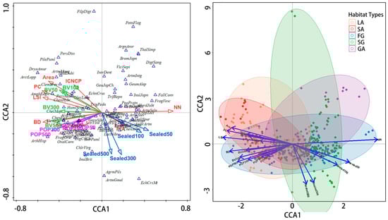 The results of the exploratory analysis, based on a canonical correspondence analysis (CCA), indicate that the cumulative variance explained by the first three axes of the fitted data is 31.7%, while the first three axes of the response data explain 2.4% of the variance (Table S1), with a total inertia of 46.381. The variable distance between the neighboring patches, PC, BD, area, and sealed surface show a relatively high explanatory power and a significant contribution to the total variation, with strong statistical significance (p = 0.001) (Figure 7) (Table S2), indicating that these variables are the key drivers influencing the distribution of dominant species in spontaneous vegetation communities (Table S3). From the distribution characteristics of dominant species in spontaneous vegetation communities, plants such as Crepis tectorum and Artemisia scoparia tend to be more distributed in areas with greater NN and stronger sealed surface, and plants such as Clematis brevicaudat and Amphicarpaea edgeworthii are more affected by area, PC, and LSI, indicating that they are more suitable for areas with larger patch areas, higher vegetation coverage, and more complex landscape shapes. Plants such as Duchesnea indica, Vicia cracca, and Chenopodium ficifolium are more adapted to areas with higher levels of BD, BV, and POP. The correlation between the above variables and species composition varies significantly in different habitat types. POP, BV, LSI, PC, area, and ICNCP are key driving factors affecting the distribution of spontaneous vegetation diversity in LA and SA habitats, and NN, sealed surface, and P/A are key driving factors affecting the distribution of spontaneous vegetation diversity in SG and GA habitats. In the FG habitat, only NN has a relatively low impact on the diversity composition of its species, with POP50/100/300/500 as its key driving factor (Figure 7).
