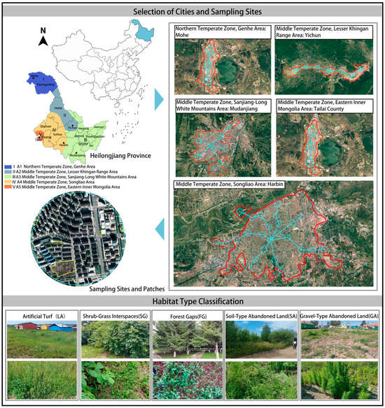 Research on urban spontaneous vegetation has a history of over 20 years in countries such as the Czech Republic, the United Kingdom, etc. [6,10,11,12], but in China, in recent years, scholars have begun to focus on the study of urban spontaneous vegetation at the urban, patch, and micro-habitat scale. The research areas are mainly located in the southern temperate zone and subtropical cities of China, such as Kunming, Beijing, Chongqing, Shanghai, Hangzhou, and Nanjing [13,14,15,16,17,18,19,20,21]; however, there are few studies of spontaneous vegetation in the cold regions of northeastern China, except for Harbin. There is a significant correlation between the abundance of spontaneous vegetation in urban environments and heterogeneous habitats [22], but how habitat heterogeneity affects the distribution and maintenance mechanisms of urban spontaneous vegetation diversity is not yet clear. Therefore, this study focuses on the built-up areas of five cities in Heilongjiang Province, located in the cold regions of northeastern China. This study analyzes the resources and composition characteristics of the spontaneous vegetation species of these cities based on field investigations, explores the distribution pattern and causes of spontaneous vegetation diversity, and reveals its formation and maintenance mechanisms in cold regions.