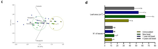 4.7. Growth Parameters of Peanut Plants Inoculated with Beads from Different Storage Times