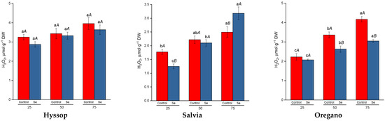 Effect of selenium on hydrogen peroxide content (H2O2) under drought stress. Different lower-case letters indicate significant differences between plants by drought level for control, Se-treatment, and each species separately, and upper-case letters indicate significant differences between control and Se-treatment at p ≤ 0.05 based on post hoc Tukey’s test (n = 4).