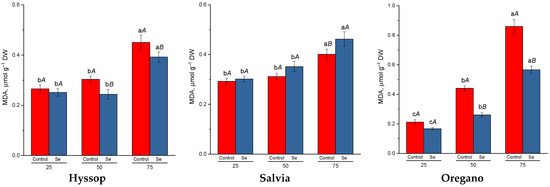 Cultivating hyssop, salvia, and oregano under drought conditions resulted in the accumulation of malondialdehyde, a marker of oxidative stress, in the plants (Figure 2). In hyssop and salvia, significantly higher levels were detected only under severe drought conditions (75%), while in oregano, the increase in malondialdehyde was observed earlier, at moderate drought levels (50%). Selenium treatment under drought conditions led to a reduction in malondialdehyde content in hyssop and oregano by 1.1 to 1.2 times and 1.5 to 1.7 times, respectively. However, in salvia, selenium treatment caused an increase in malondialdehyde levels compared to untreated plants under the same conditions.