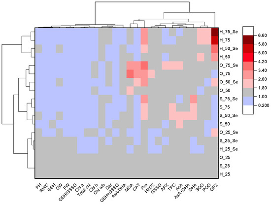 Heat map with clusters for the studied parameters (at the top) and Lamiaceae species cultivated under different levels of drought without and with Se-treatment (on the left). PH, plant height; FW, fresh weight; DW, dry weight; RWC, relative water content; MDA, malondialdehyde; H2O2, hydrogen peroxide; Chl a, chlorophyll a; Chl b, chlorophyll b; Chl a/b, chlorophyll a/b ratio; Total chl, total chlorophylls; Car, carotenoid; Pro, proline; GSH, reduced glutathione; GSSG, oxidized glutathione; AsA, ascorbic acid; DHA, dehydroascorbic acid; TPC, total phenolic compounds; SOD, superoxide dismutase; CAT, catalase; APX, ascorbate peroxidase; GPX, glutathione peroxidase; POD, peroxidase. H_75, H_75_Se, H_50, H_50_Se, H_25, H_25_Se, S_75, S_75_Se, S_50, S_50_Se, S_25, S_25_Se and O_75, O_75_Se, O_50, O_50_Se, O_25, O_25_Se, hyssop, salvia, and oregano plants cultivated at 75%, 50%, and 25% of drought stress without and with Se-treatment, respectively.