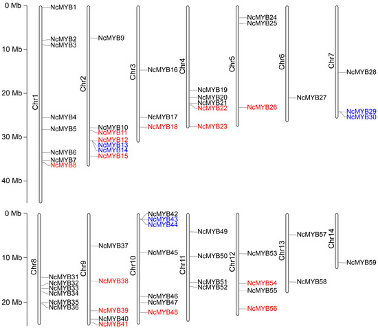Distribution of R2R3-MYB genes on the chromosomes in N. colorata. The scale on the left side of the image represented the length of the chromosomes. Genes labeled in red indicate segmental duplication genes, while genes labeled in blue indicate tandem duplication genes.