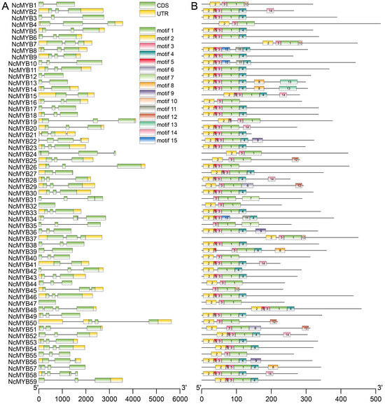 Structural analysis of R2R3-MYB in N. colorata. (A) Gene structure of R2R3-MYB genes. The scale bar at the bottom represented gene length. Yellow rectangles indicate untranslated regions (UTR), while green rectangles represent coding sequence (CDS). (B) The conserved motif of R2R3-MYB transcription factors. The scale bar at the bottom represents the number of amino acids. Each rectangle represents a motif, with detailed sequences provided in Figure S1.