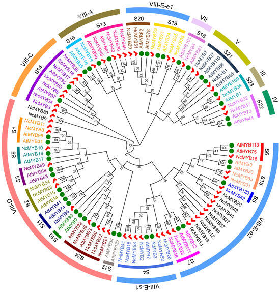 To investigate the phylogeny of R2R3-MYB proteins in N. colorata, multiple sequence alignments and a phylogenetic tree were constructed. The conserved R2 and R3 domains were present in all proteins in N. colorata (Figure S2). A phylogenetic tree was constructed using all R2R3-MYB protein sequences in N. colorata and partial R2R3-MYB protein sequences in Arabidopsis. The majority of R2R3-MYB proteins in N. colorata were correctly classified, with the highest numbers in groups S4 and S14 (Figure 3). There were no members in groups S10 and S12 in N. colorata. Using an alternative classification rule, the R2R3-MYB proteins in N. colorata were divided into 10 groups, with the most members in groups VIII-D and VIII-E-e2 and the fewest in group VII. Proteins in groups VIII-E-e1, III, IV, V, and VII clustered together, suggesting closer evolutionary relationships and potential functional similarities (Figure 3).
