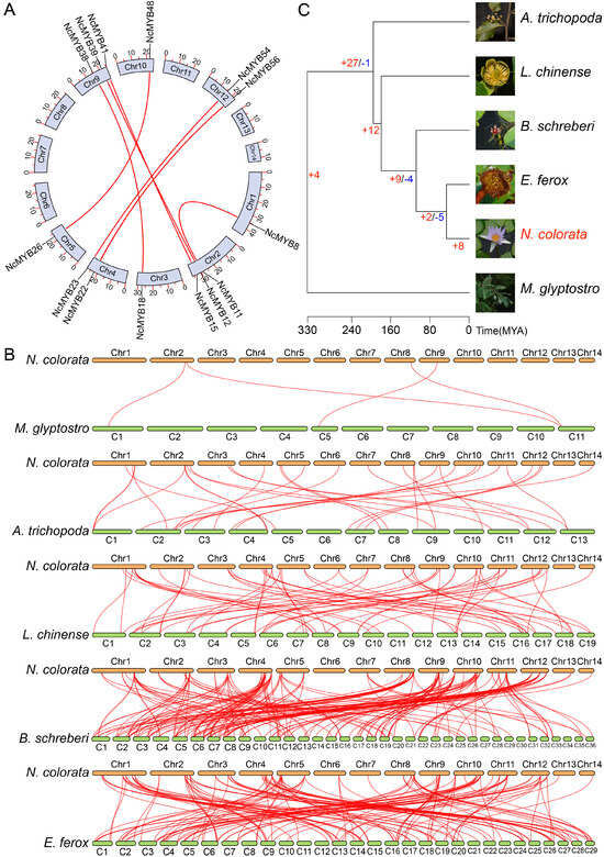 Evolutionary analysis of R2R3-MYB genes in N. colorata. (A) Segmental duplication genes of R2R3-MYB genes in N. colorata. (B) Collinearity analysis between N. colorata and five other species. (C) Evolutionary history of R2R3-MYB genes in N. colorata. Species trees and divergence times between species were obtained from the TimeTree website. Red-labeled numbers indicate newly evolved genes, while blue numbers indicate lost genes. Species illustrations were from the Plant Photo Bank of China (PPBC).