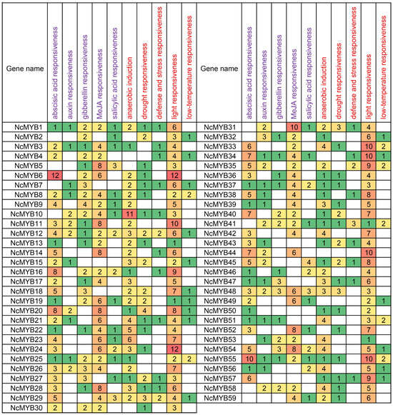 To explore their potential biological functions, the cis-acting elements in R2R3-MYB gene promoters were analyzed. The promoters of R2R3-MYB genes in N. colorata contained the cis-acting elements responsive to hormone signals and environmental stress. ABA-responsive cis-acting elements were found in 49 R2R3-MYB gene promoters, auxin-responsive cis-acting elements in 30, gibberellin-responsive cis-acting elements in 37, MeJA-responsive cis-acting elements in 46, and SA-responsive cis-acting elements in 29 (Figure 5). Most promoters of R2R3-MYB genes in N. colorata, except those of NcMYB50 and NcMYB57 genes, possessed more than one type of hormone-responsive element. Light-responsive cis-acting elements were present in all promoters. Additionally, 37 gene promoters possessed drought stress-responsive elements, and 23 genes possessed cold stress-responsive elements. Fourteen gene promoters possessed cis-acting elements responsive to both cold and drought stress, indicating possible involvement in the responses to drought and cold stress (Figure 5).