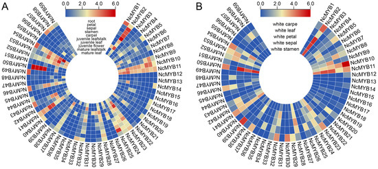 Expression pattern of R2R3-MYB genes in different tissues based on transcriptome data. (A) Expression patterns of R2R3-MYB genes in N. colorata petals. (B) Expression patterns of R2R3-MYB genes in White colorata petals.