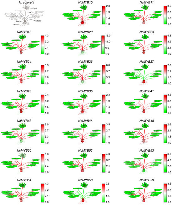 Expression levels of R2R3-MYB genes in N. colorata based on qRT-PCR analysis.
