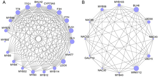 Core network of PPI analysis for R2R3-MYB in N. colorata. (A) Cluster 1 module. (B) Cluster 2 module.