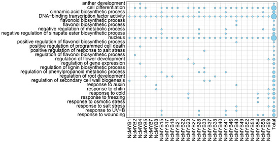 GO functional analysis of R2R3-MYB proteins in N. colorata. The x-axis represents R2R3-MYB proteins, while the y-axis represents GO terms. Larger circles indicate a greater number of proteins.
