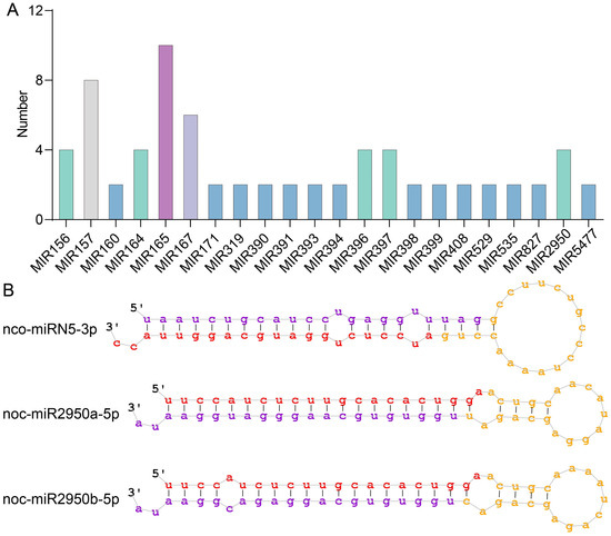 Identification of miRNAs in N. colorata. (A) Statistics of identified miRNA family members. (B) Representative stem–loop structures of identified miRNA precursors. Red is the mature miRNA sequence, purple is the miRNA-star sequence, and yellow is the non-miRNA and loop sequences in the stem.