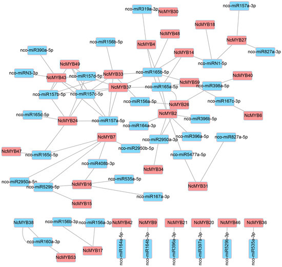 Regulation of R2R3-MYB gene expression miRNA in N. colorata. The blue-filled rectangle with a red border represents the miRNA in N. colorata, and the red-filled rectangle with a blue border represents the R2R3-MYB gene in N. colorata. Gray lines indicate potential regulatory relationships between the miRNAs and R2R3-MYB genes.